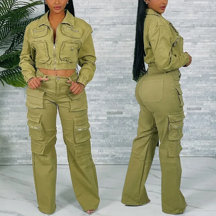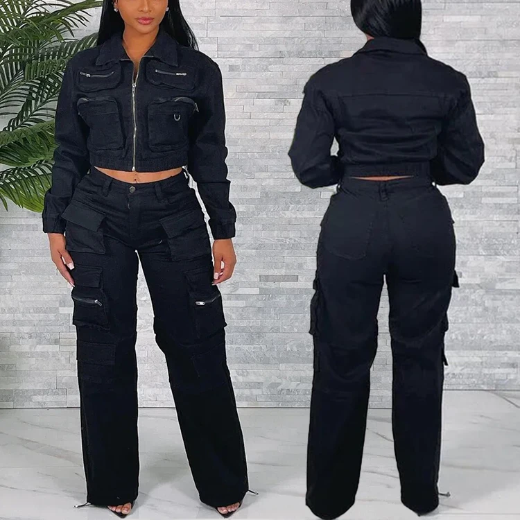 Huili Manufacturer Oem Custom Vintage Acid Washed Denim Crop Top Cargo Jacket & Jeans Pants Multi Pockets Women Two Piece Sets